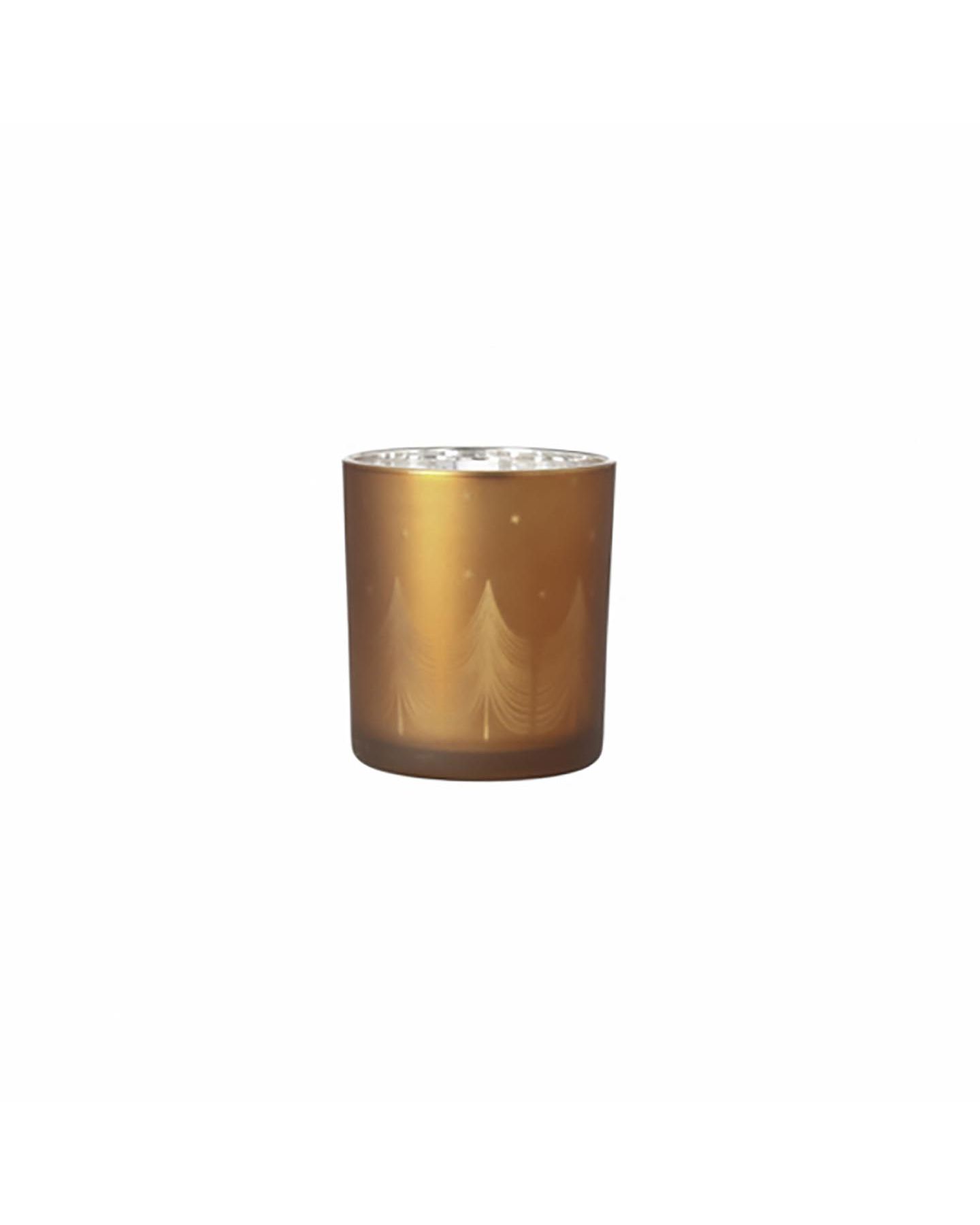 Photophore en verre doré mat orné des motifs sapins avec un intérieur doré pour une lumière douce et une ambiance romantique. A compléter avec une bougie chauffe-plat ou bougie classique disponible en magasin et dans la catégorie Bougie et Diffuseur.