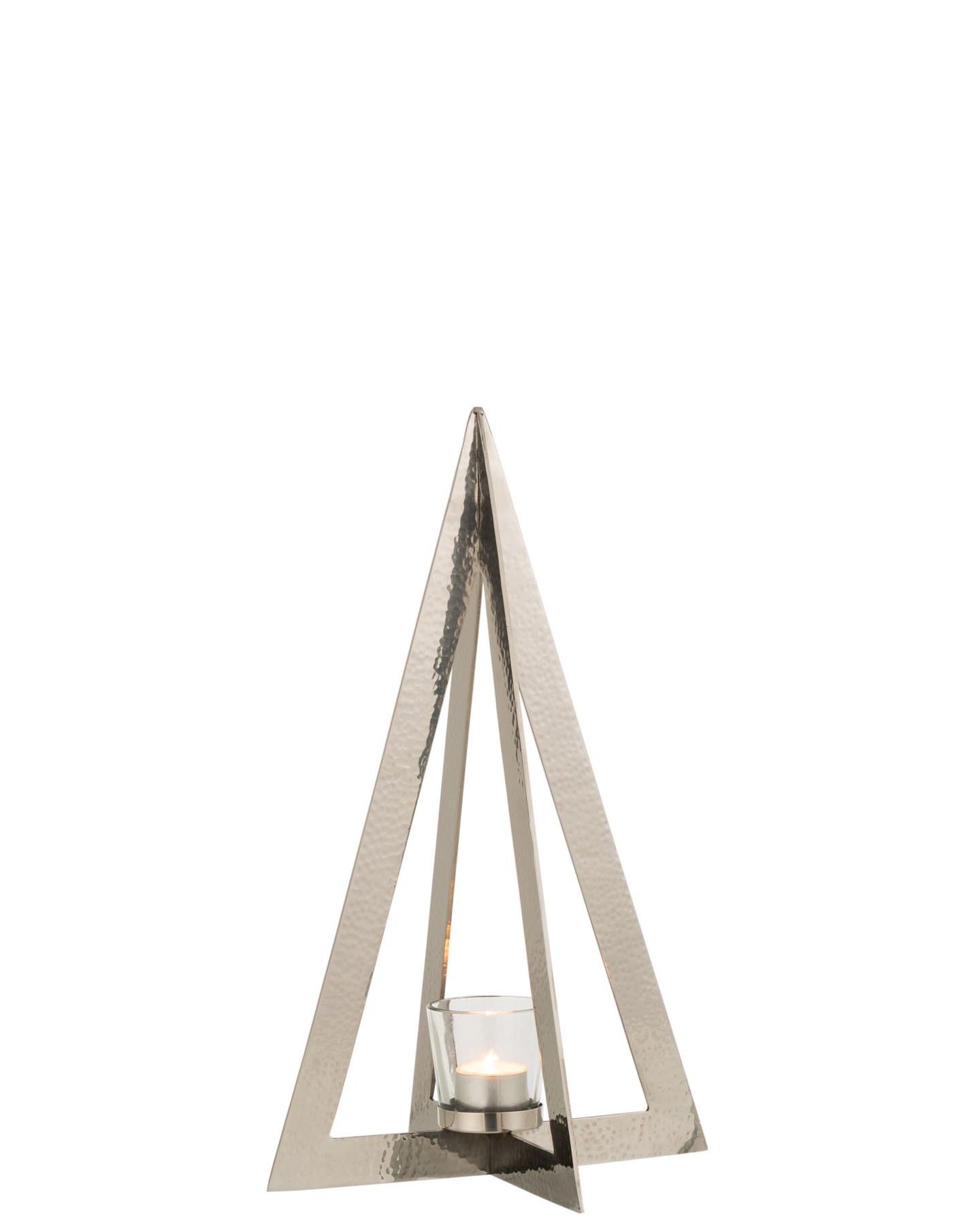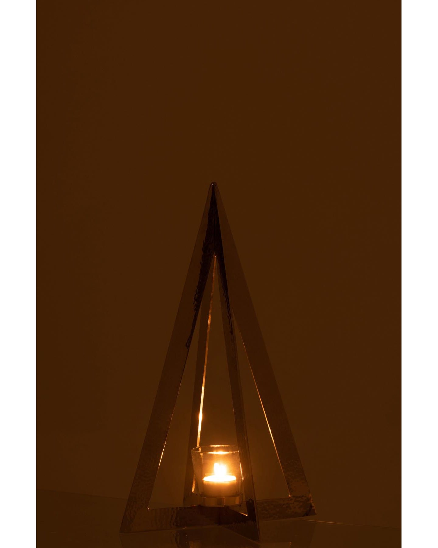 Photophore triangulaire en verre transparent et acier argenté légèrement martelé pour éclairer votre table ou terrasse. Habillez votre photophore d'une bougie disponible en magasin et dans la catégorie Bougie et Diffuseur.