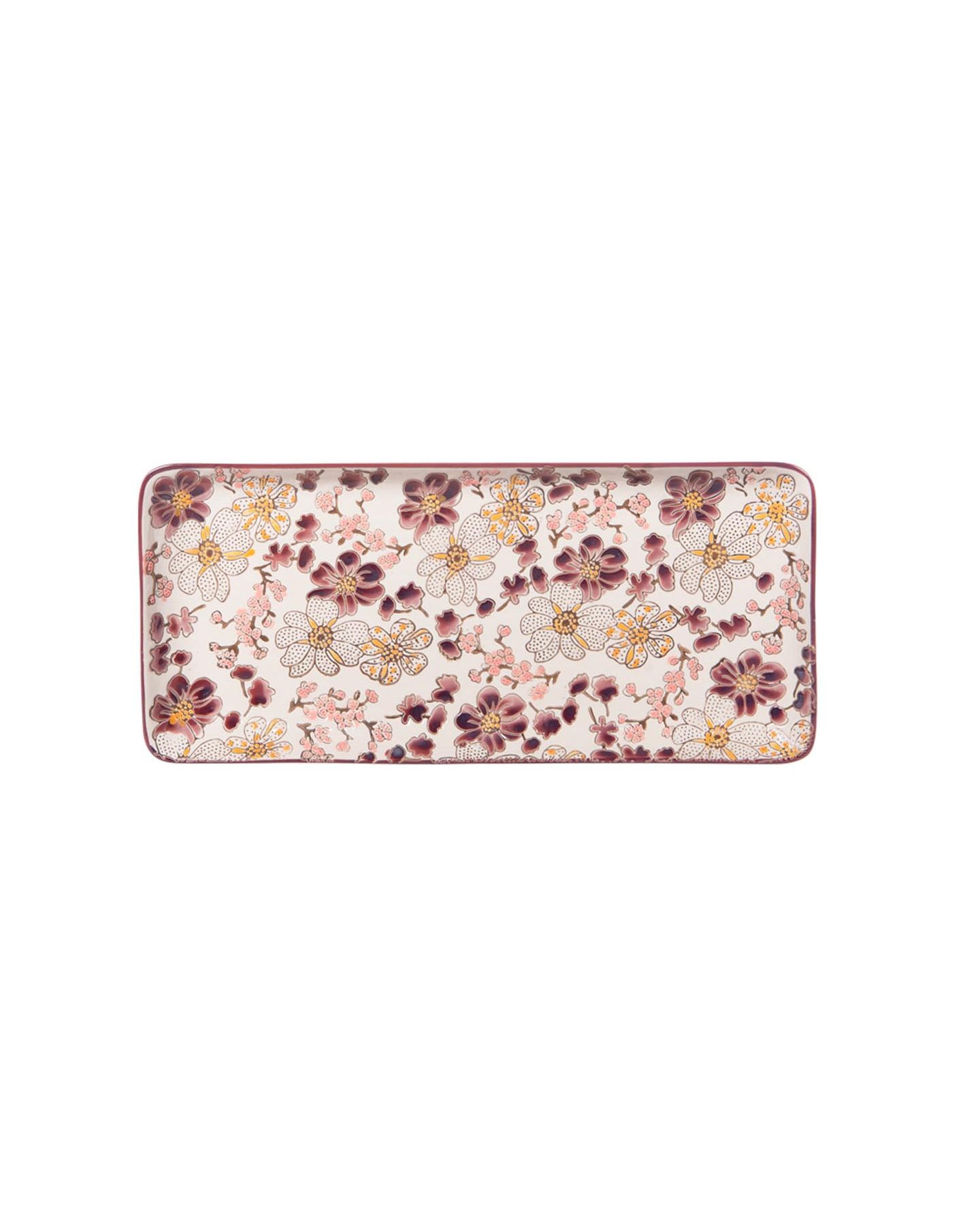 Magnifique plat à tarte rectangulaire en grès crème aux motifs floraux délicats bordeaux, safran, crème et rose poudré pour présenter vos créations sucrées ou salées de manière élégante et raffinée, tout en ajoutant une touche de prestige à vos moments gourmands. Son design élégant et original fera de chaque présentation un véritable spectacle culinaire.