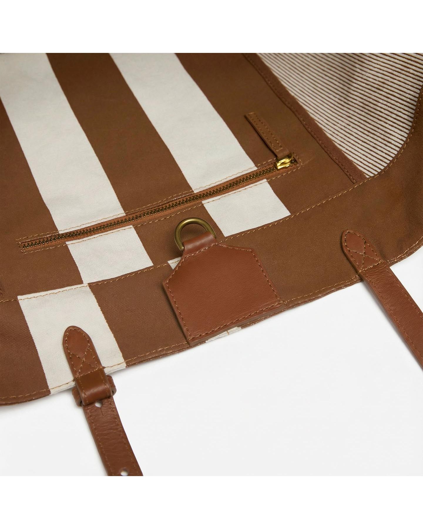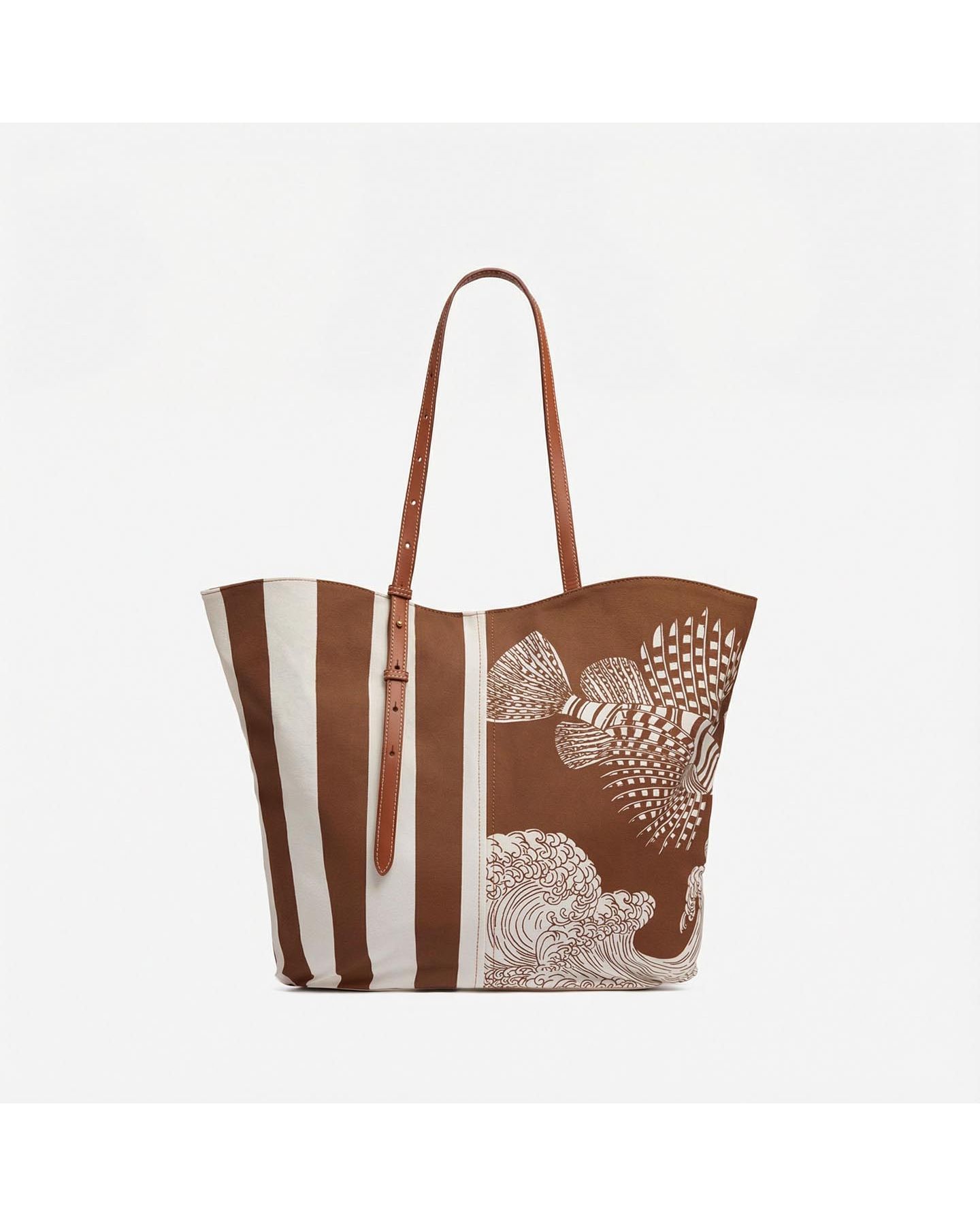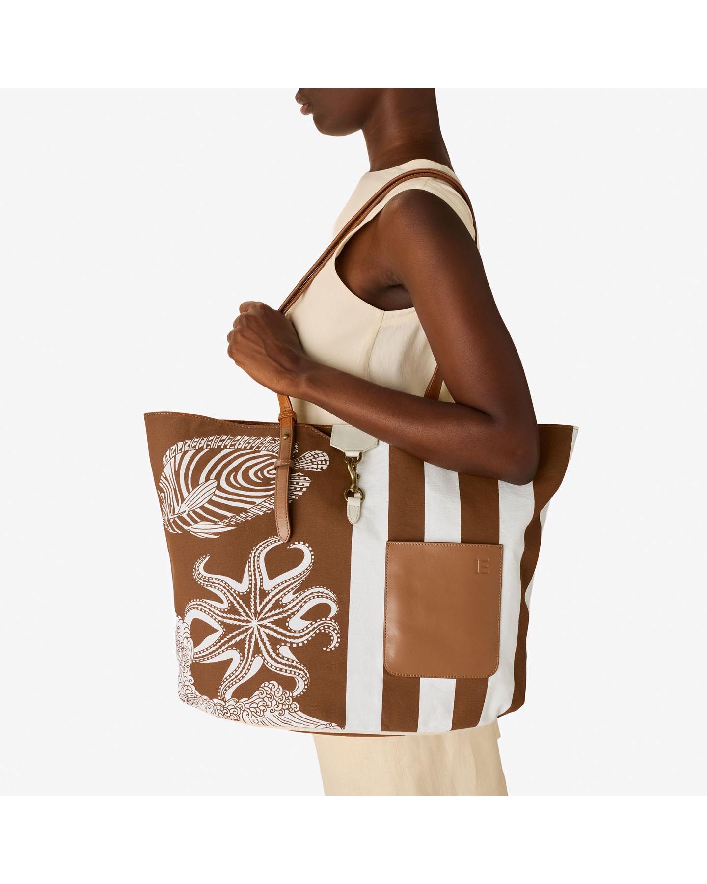 Sac cabas en toile de coton imprimé aux motifs marins pour transporter tous vos effets personnels, comme votre ordinateur portable. Doté des anses en cuir, ce sac peut être porter à la main ou à l'épaule. Il est également équipé d'une poche intérieure zippée pour garder vos indispensables à portée de main. Renforcé par des finitions en cuir, le sac conserve sa structure raffinée et s'adapte à toutes les tenues. Fabriqué en Inde. Sac en 100% coton, avec des finitions en cuir. Fabriqué en Inde.