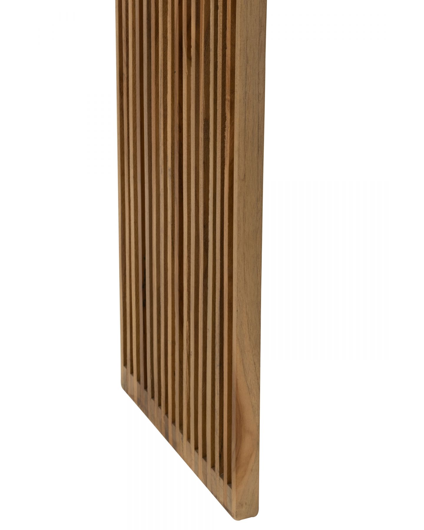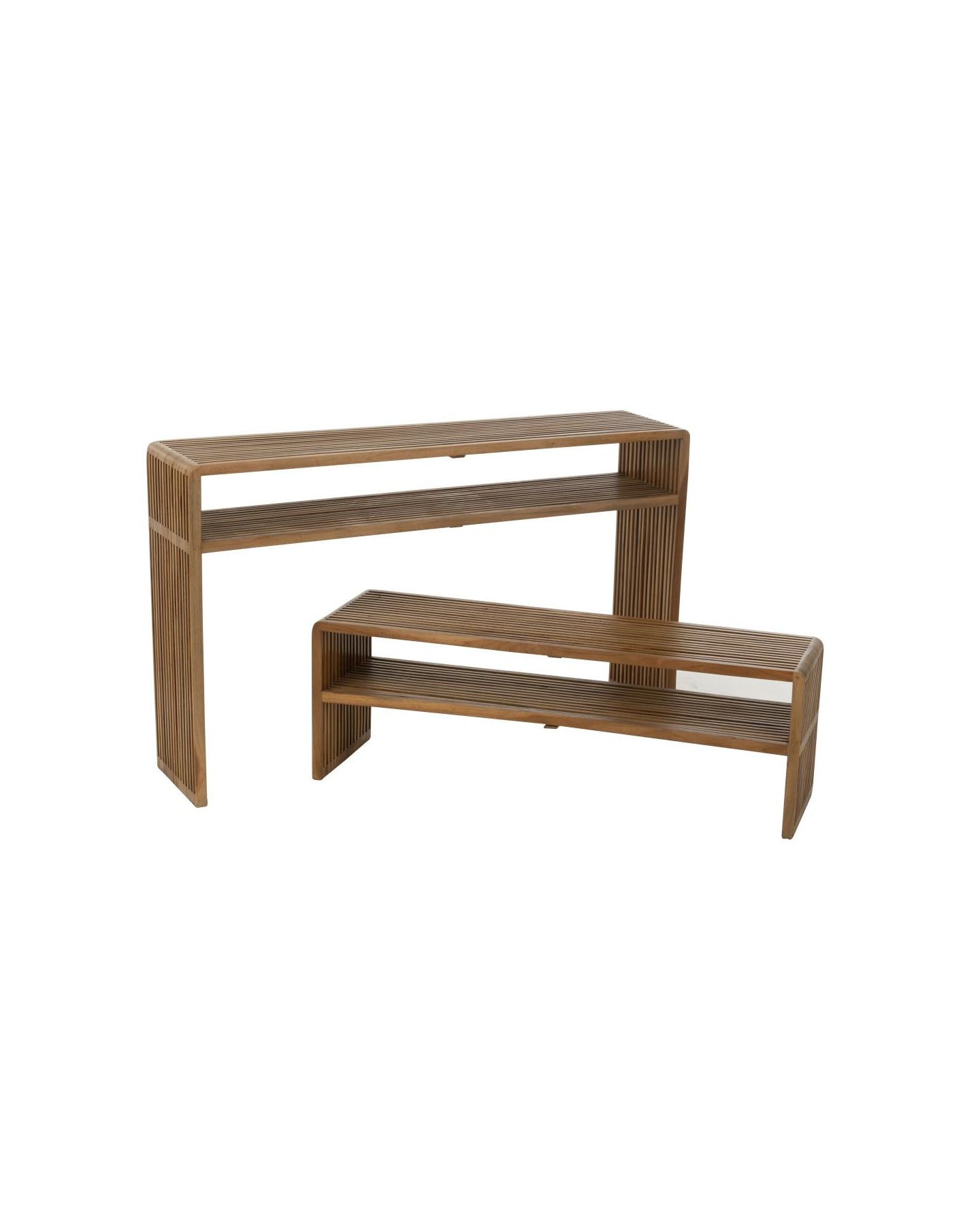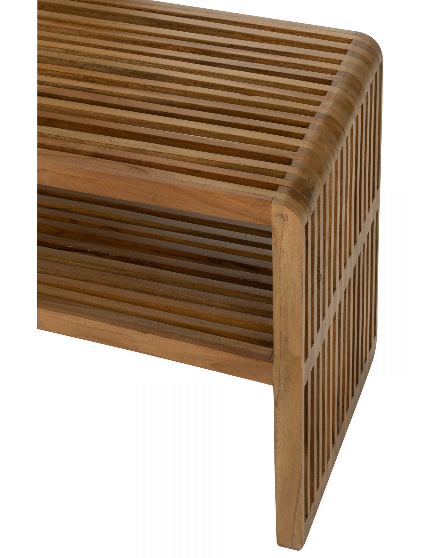 Élégante console basse en bois de teck recyclé avec d'un style contemporain. Avec un étagère pratique, cette table est caractérisée par une ligne épurée, soulignée par un plateau et des pieds en bois naturel pour sublimer votre décoration.