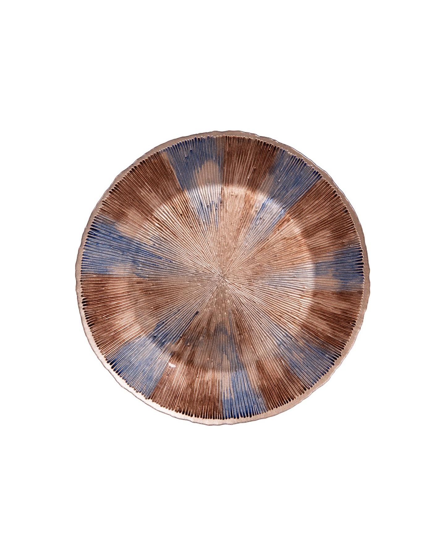 Grande coupe en verre délicatement rayé aux tons bronzés et bleus avec une finition brillante, elle incarne à la fois raffinement et poésie. Idéale en centre de table ou en coupe décorative, elle capte la lumière et attire le regard par ses reflets subtils. Une pièce forte et sophistiquée pour sublimer vos intérieurs.