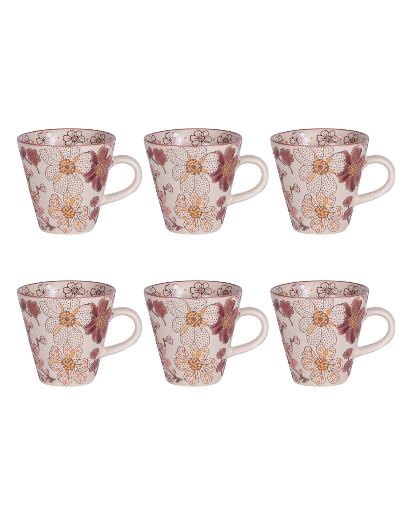 Coffret de six tasses à café de 17 cl en grès crème aux motifs floraux délicats bordeaux, safran, crème et rose poudré. Une collection raffinée avec une finition brillante et les légers reliefs créés par les rappels de couleurs en font une vaisselle de caractère, qui apportera lumière et bonne humeur à votre table et décoration intérieure. Compatible lave-vaisselle et micro-ondes.