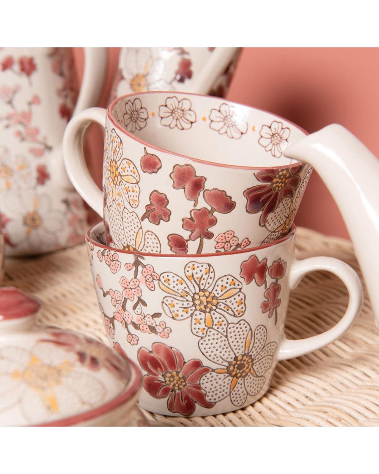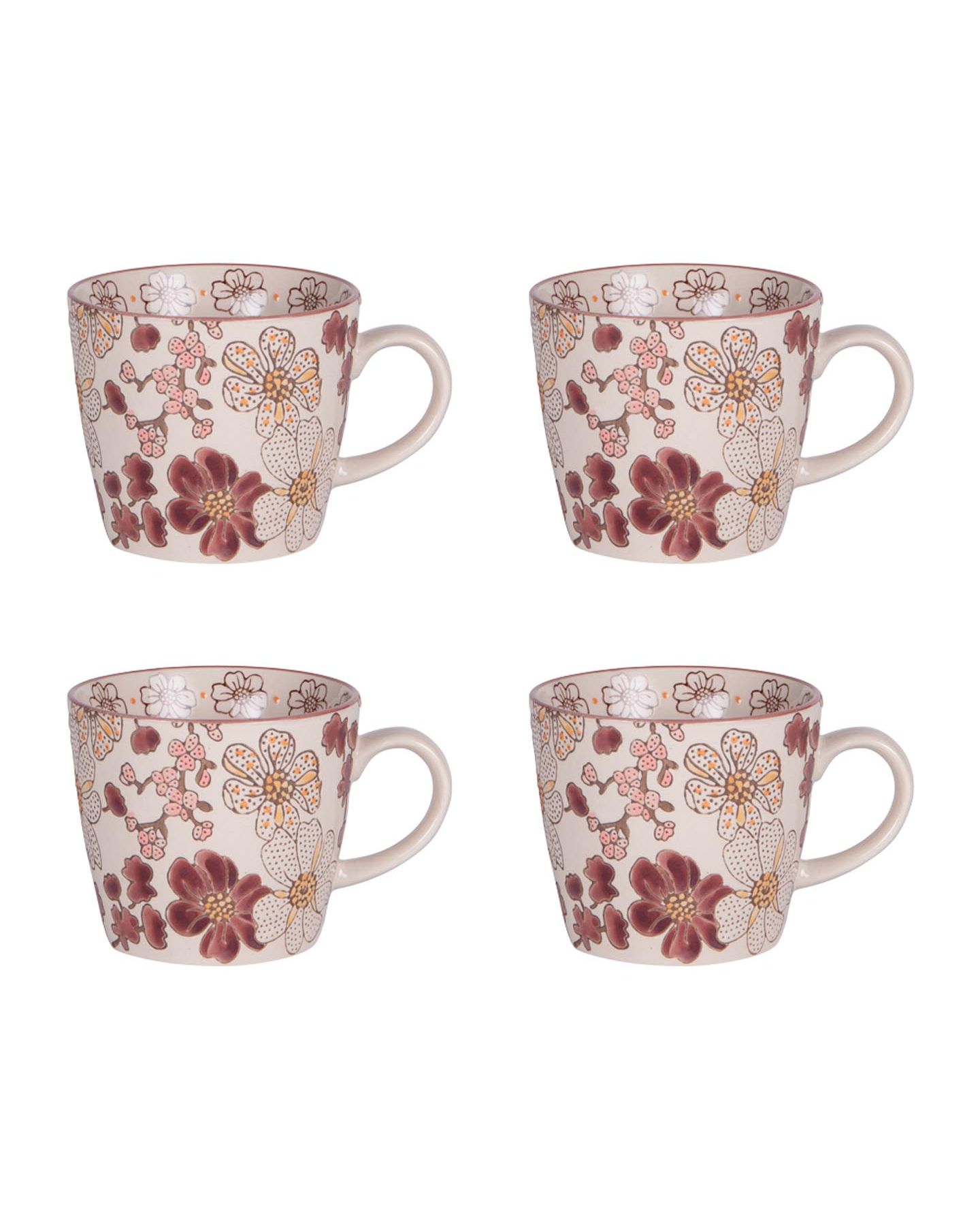 Coffret de quatre tasses de 36 cl en grès crème aux motifs floraux délicats bordeaux, safran, crème et rose poudré. Une collection raffinée avec une finition brillante et les légers reliefs créés par les rappels de couleurs en font une vaisselle de caractère, qui apportera lumière et bonne humeur à votre table et décoration intérieure. Compatible lave-vaisselle et micro-ondes.