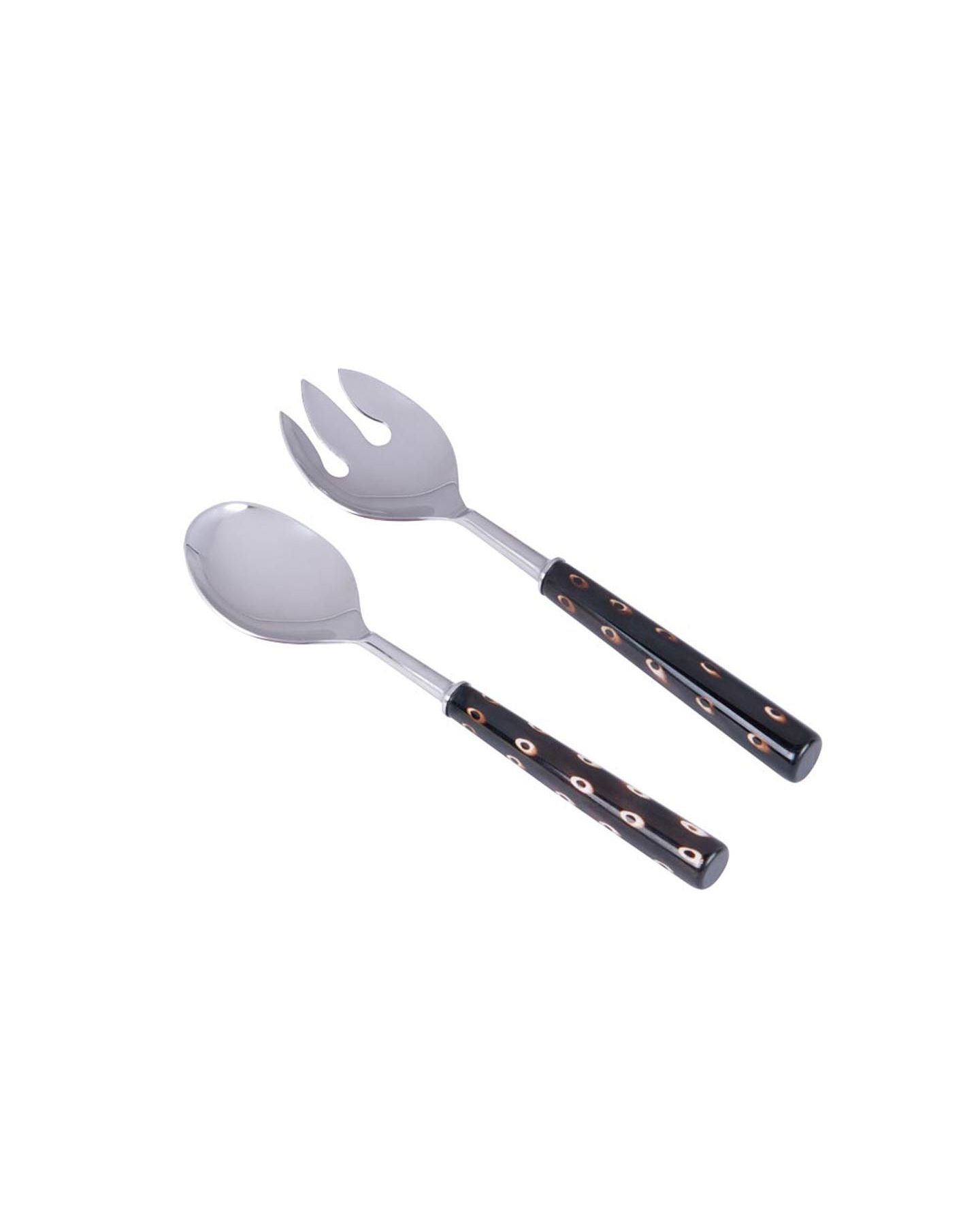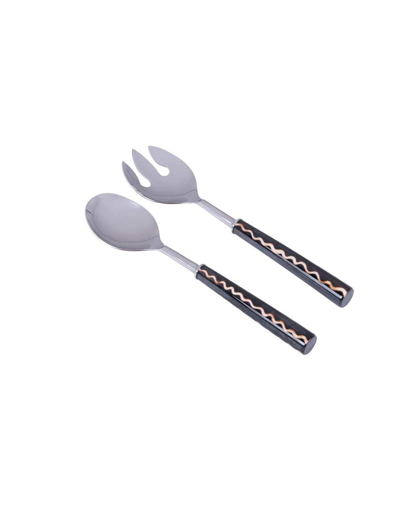Deux couverts de service à salade en inox avec manche ornée de motifs géométriques en relief, offrant une prise en main confortable et agréable. A associer avec saladier disponible en magasin ou dans la catégorie Vaisselle. Motif au choix dans la limite des stocks disponible : ronds ou lignes ondulées.