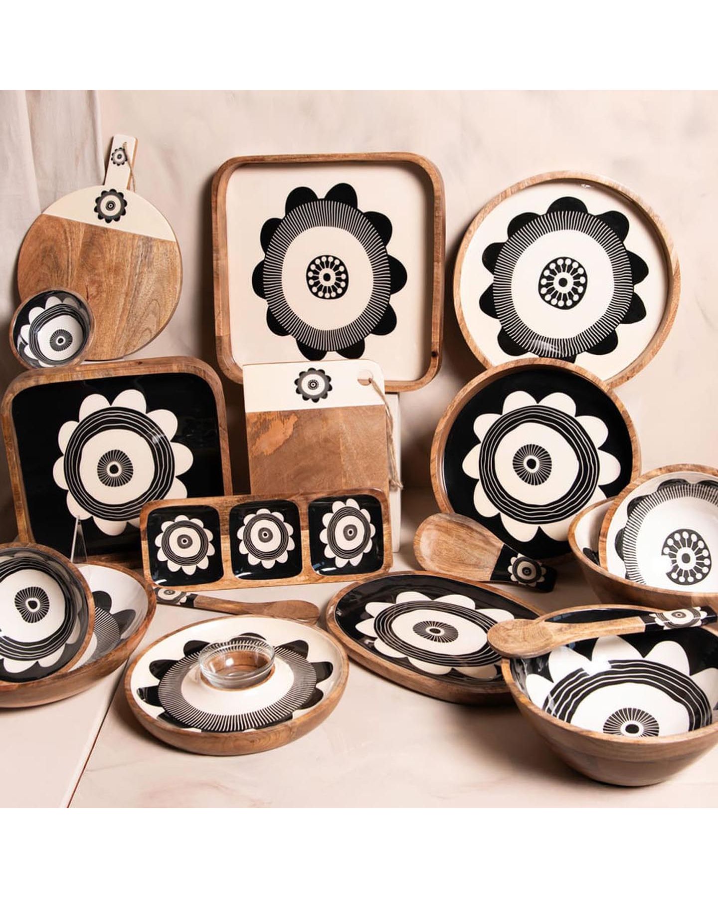 Saladier en bois manguier, émaillé à l'intérieur en blanc au motifs motifs géométriques noirs au style unique. Avec sa fabrication artisanale et finitions soignées, ce saladier est parfait pour recevoir avec style ou apporter une note raffinée à votre quotidien.