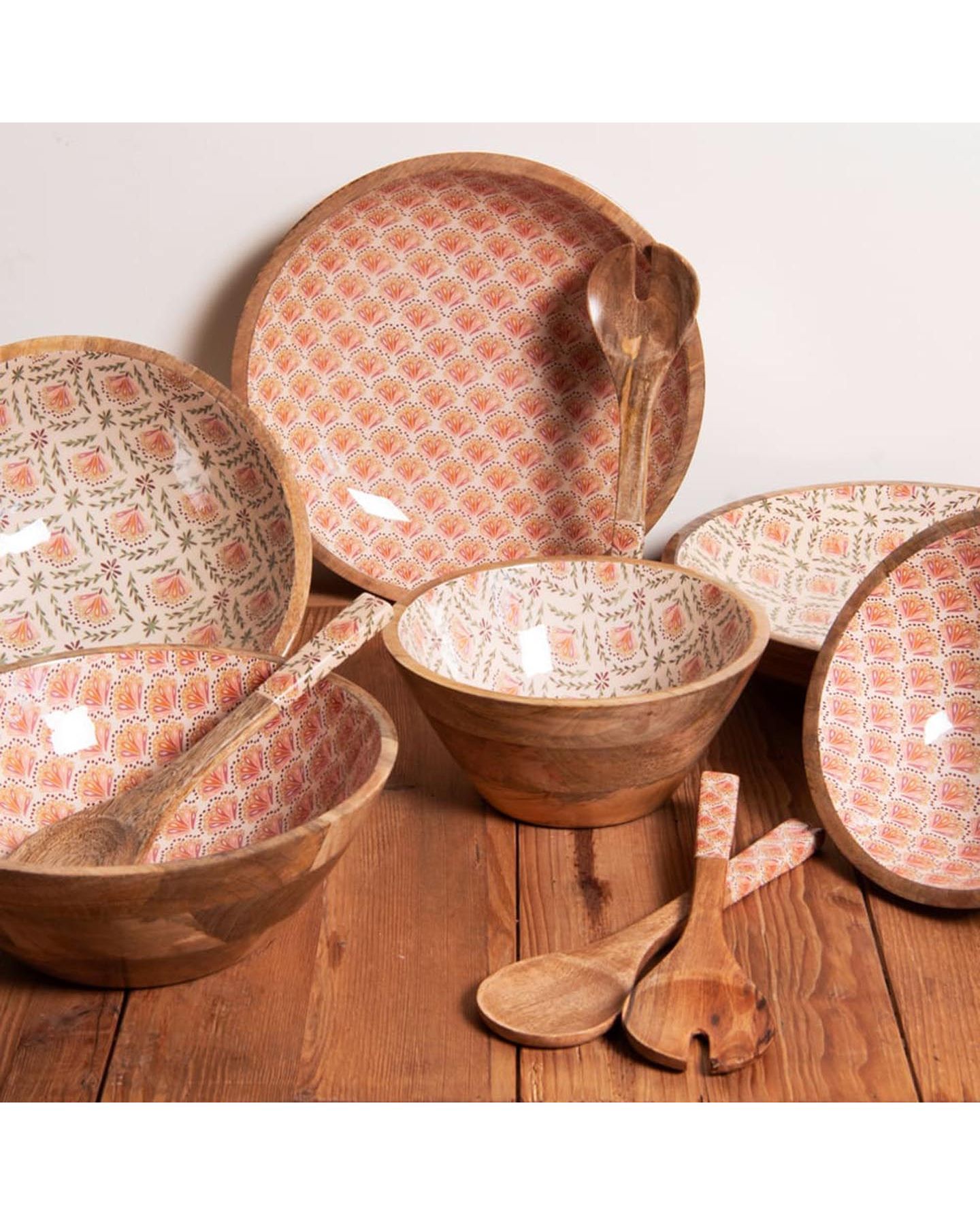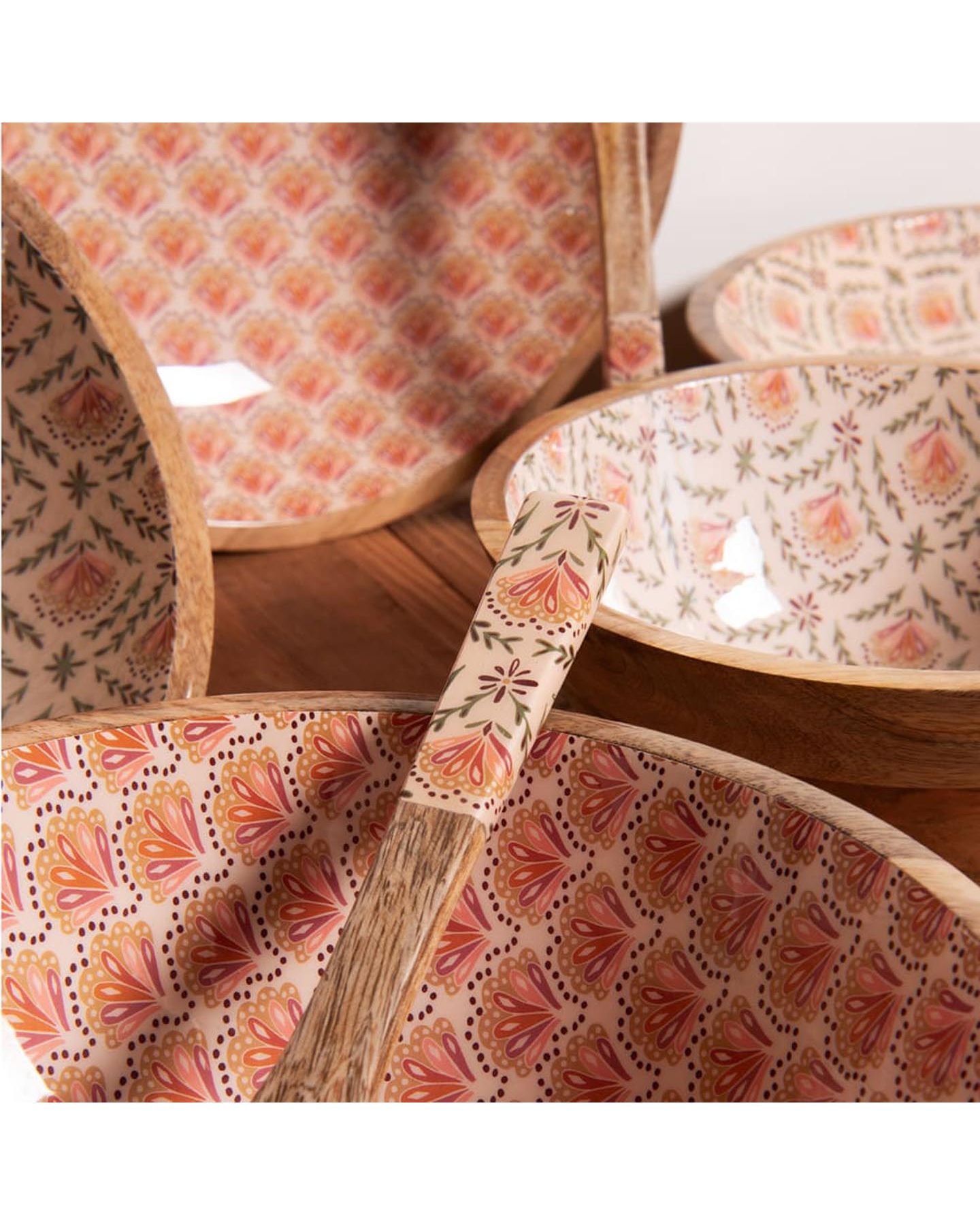 Saladier en bois manguier, émaillé à l'intérieur aux motifs délicats d'inspiration indienne. Avec sa fabrication artisanale et finitions soignées, ce saladier est parfait pour recevoir avec style ou apporter une note raffinée à votre quotidien.