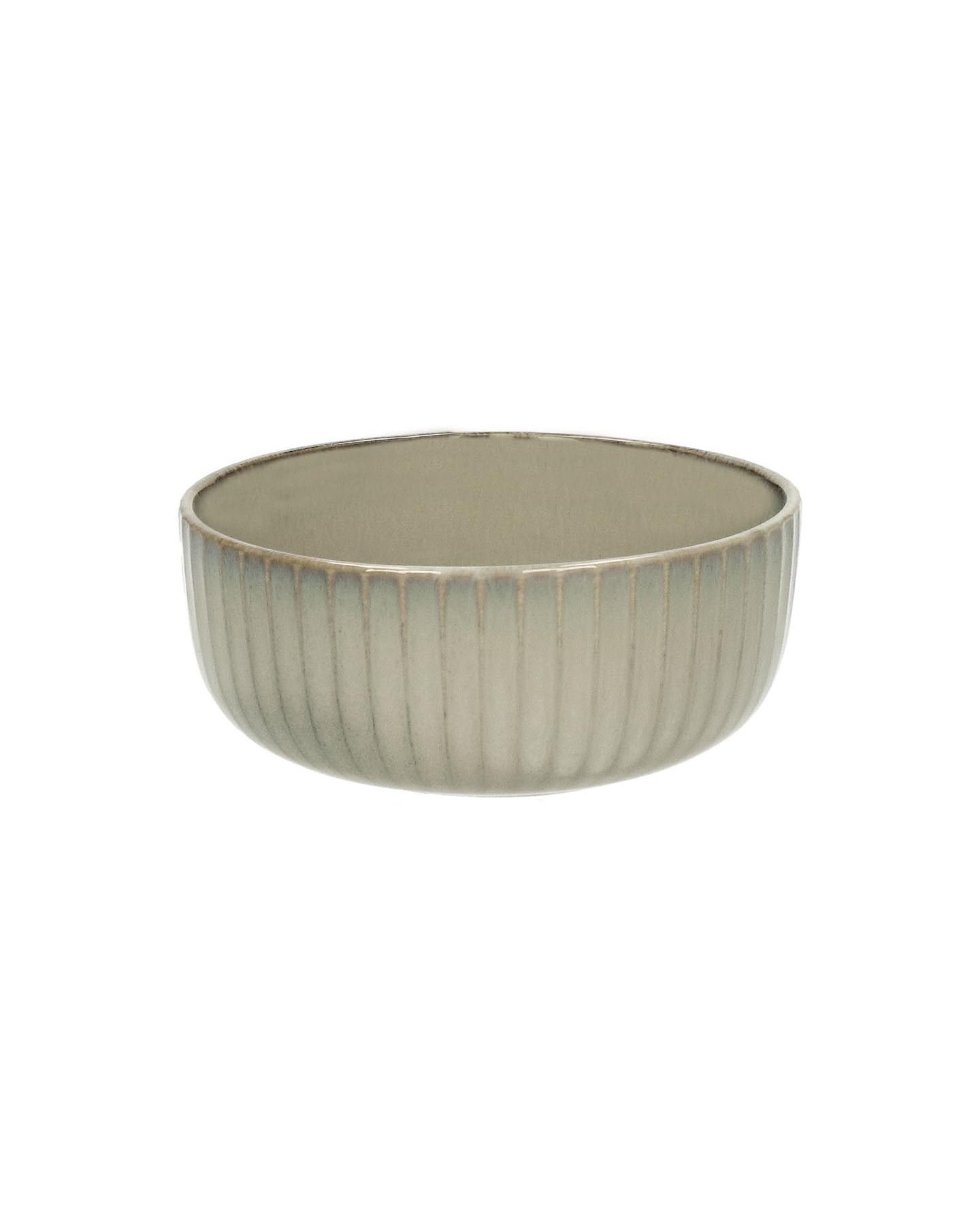 Bol en grès orné d'un relief rayé et d’une glaçure grège, ce qui fait ressortir davantage ses rayures sur les bords. Un bol avec une forme simple et classique, un vrai confort pour tous les jours.