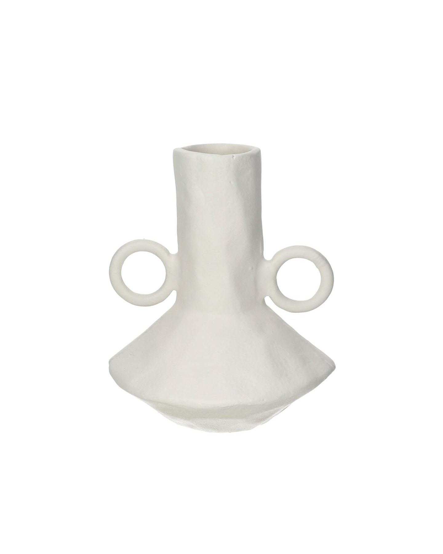 Vase rond décoratif en aluminium blanc cassé avec un anse de chaque côté pour apporter une touche élégante et originale à votre décoration. Pour mettre en valeur un bouquet ou à disposer comme simple objet de décoration.