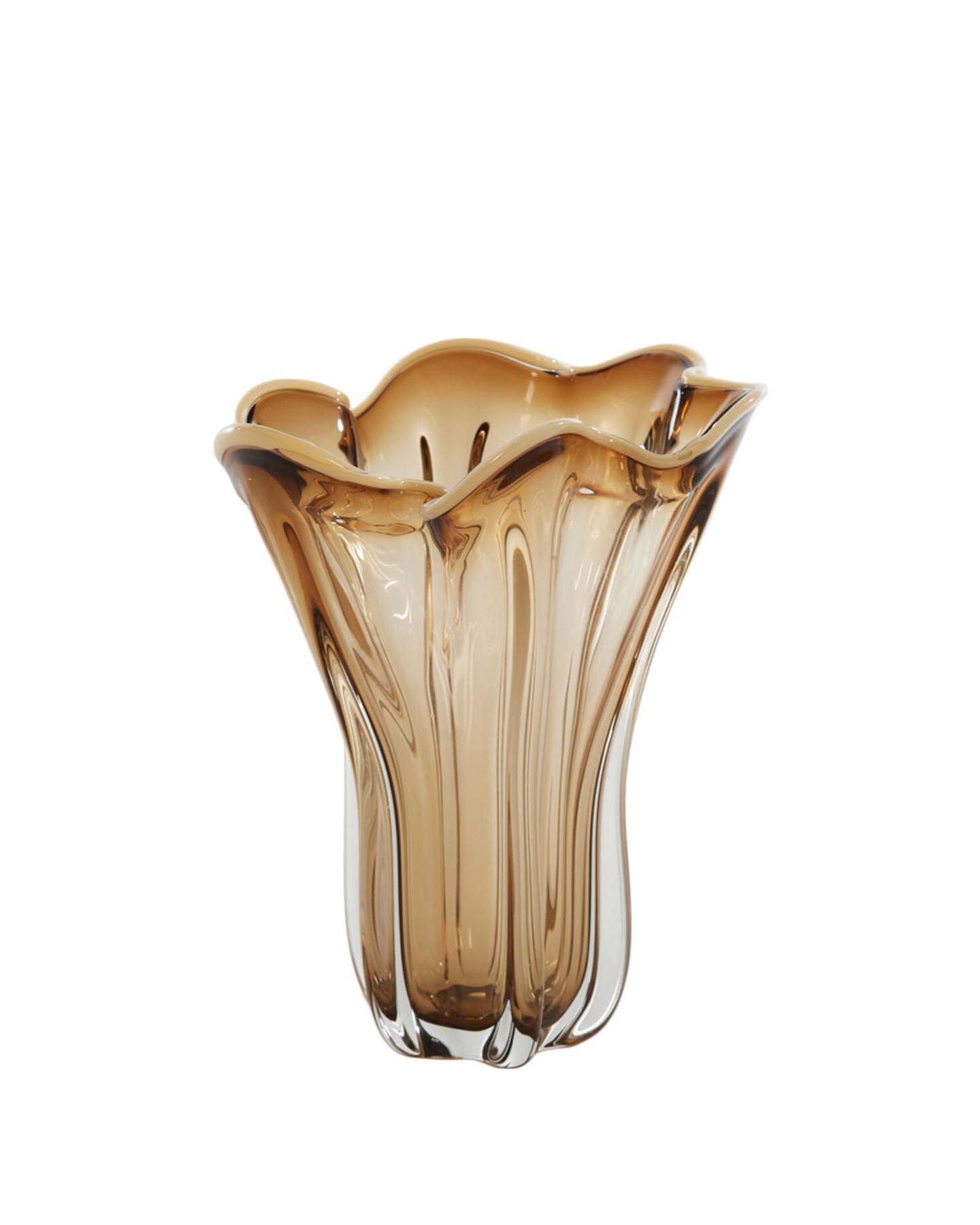 Vase décoratif d'une forme originale en verre marron transparent aux accents crème pour mettre en valeur un bouquet ou à disposer comme simple objet de décoration.