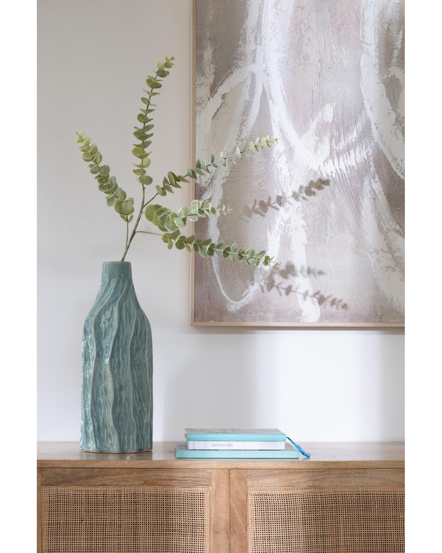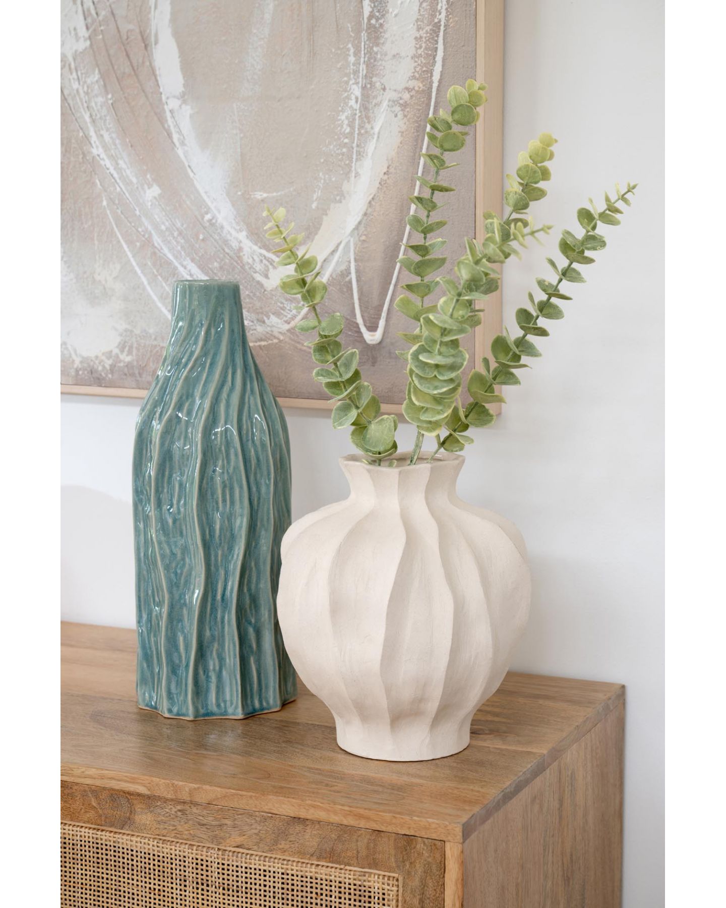 Grand vase décoratif rond forme bouteille en porcelaine bleu avec des rayures irrégulières en relief d'un design contemporain et élégant pour mettre en valeur un bouquet ou à disposer comme simple objet de décoration.